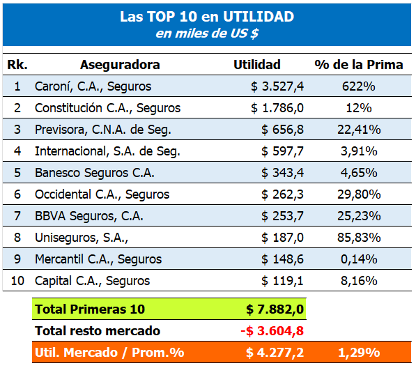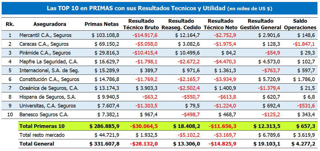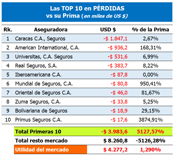 TOP 10 en Pérdidas: Se muestran las aseguradoras con mayores pérdidas acumuladas en el período y lo más importante, cuánto representa esta pérdida, se su prima neta cobrada.