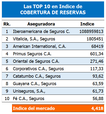 Índice de Cobertura de Reservas: El Índice de Cobertura de Reservas es equivalente al cociente entre las Inversiones Aptas para la Representación de las Reservas Técnicas (Cuenta 201) y las Reservas Técnicas (Cuenta 401). Si el índice es mayor o igual que 1, hay suficiencia de cobertura. Habrá insuficiencia de cobertura si el índice es menor que uno.