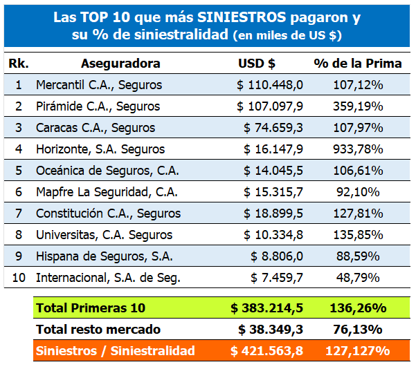 Se incluyeron las siguientes tablas nuevas: Las TOP 10 en Pérdidas y su % sobre la prima y  Las TOP 10 que más SINIESTROS pagaron y su % de siniestralidad.
